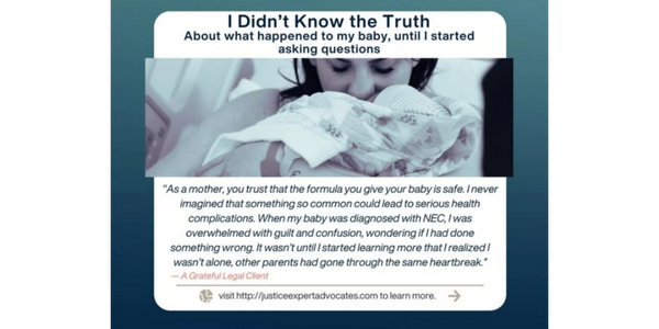 No parent should have to question the safety of their baby's formula. If your child was diagnosed with NEC (Necrotizing Enterocolitis) after consuming cow’s milk-based formula, you are not alone. Justice Expert Advocates is here to help.